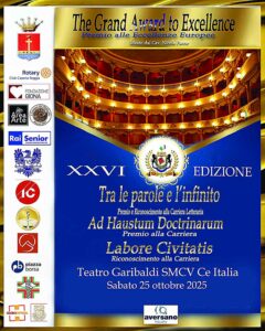 Si terrà sabato 25 ottobre 2025 (ore 19), presso la suggestiva location del Teatro “Garibaldi” di Santa Maria Capua Vetere (Caserta), il gran Gala finale della 26esima edizione del Premio Internazionale “The Grand Award to Excellence” – Premio alle Eccellenze Europee – “Tra le parole e l’infinito” e “Labore Civitatis”.