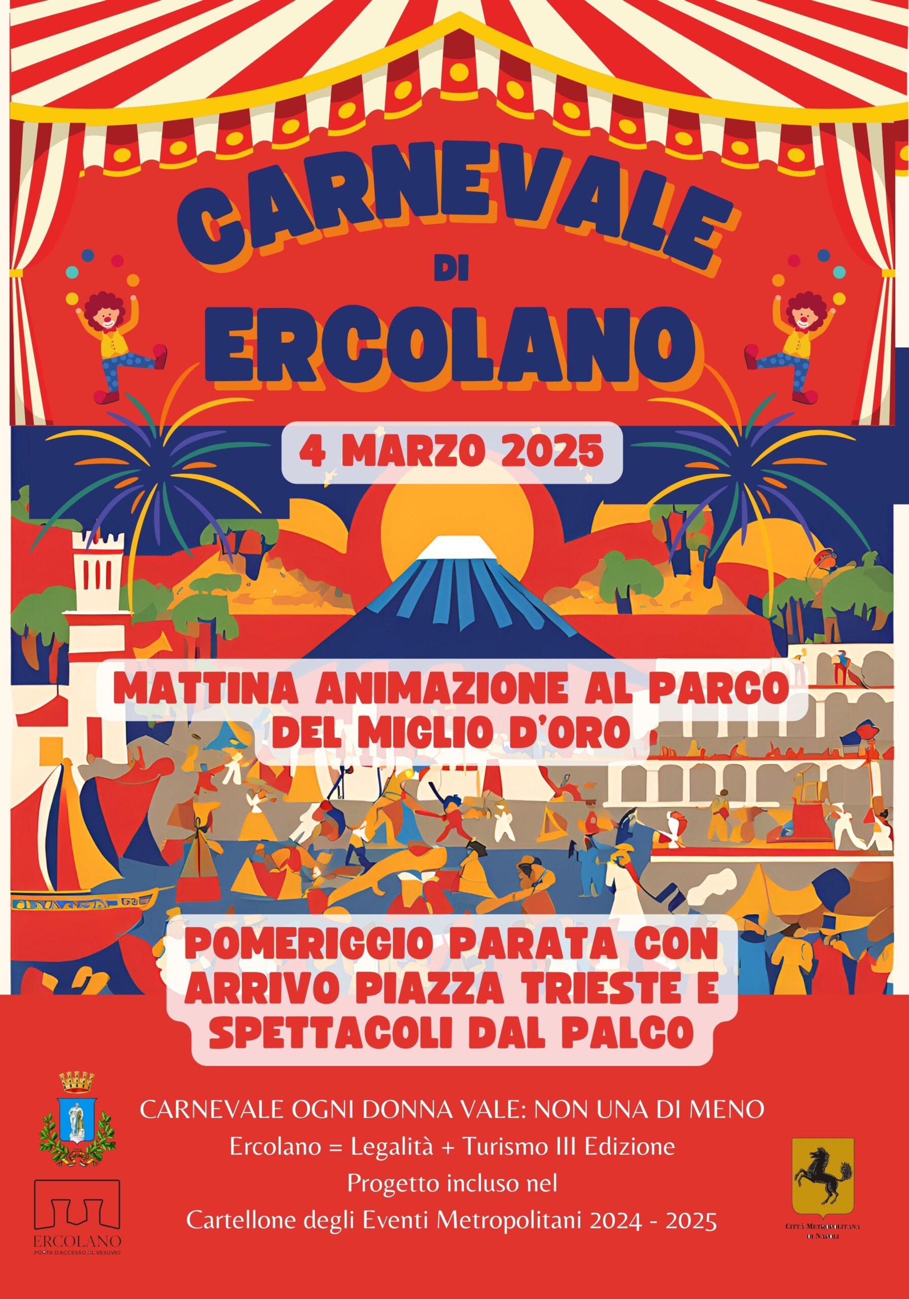 Il clou è previsto il 4 marzo, martedì grasso, con l’evento denominato “Carnevale ogni donna vale: Non una di meno” un’intera giornata di divertimento organizzata grazie al contributo di Città Metropolitana, con un progetto incluso nel “Cartellone degli Eventi Metropolitani 2024-2025”. Si comincia la mattina al Parco del Miglio d’Oro, dalle 10,00 alle 13,00, con un’animazione dedicata prettamente ai bambini, ci saranno tanti gonfiabili, baby trucco e baby dance, spettacolo di burattini, allestimento con palloncini, tanta musica e anche un simpatico carrettino con pop corn e zucchero filato. Il pomeriggio, dalle ore 16,00, comincerà la parata che attraverserà tutte le principali strade di Ercolano, in apertura una splendida carrozza condotta da due cavalli, alle spalle ci sarà la banda musicale, le majorette, animatori tematici, giocolieri e mascotte, il tutto condito da chili e chili di coriandoli. La festa si sposterà quindi in piazza Trieste, dove sarà allestito un palco pronto ad accogliere la cittadinanza già dalle 18,00, con speaker e DJ, sculture di palloni, face-painting, spettacolo con mascotte e YouTube dance, sfilata delle mascherine con coriandolata, DJ ballon party. Sul palco si alterneranno alcuni artisti locali per terminare alle 21,00 con lo spettacolo del comico Salvatore Gisonna.