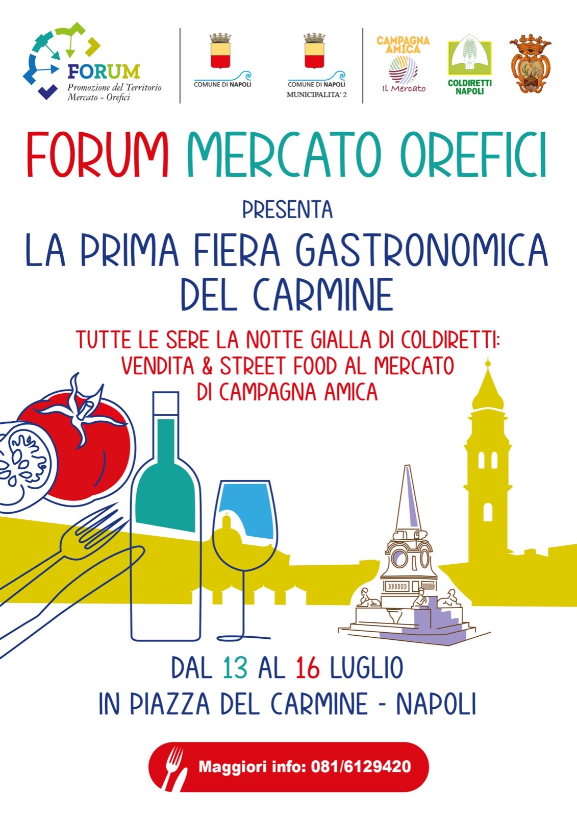Oltre venti stand in Piazza del Carmine per la Prima fiera gastronomica che si svolgerà dal 13 al 16 luglio, promossa dal Forum Promozione del Territorio Mercato – Orefici. La Fiera prevede, oltre ad artisti di strada, performance e concerti. Torna lo spettacolo pirotecnico al Campanile e “la Notte Gialla di Coldiretti”, con la vendita e lo Street Food di Campagna Amica.