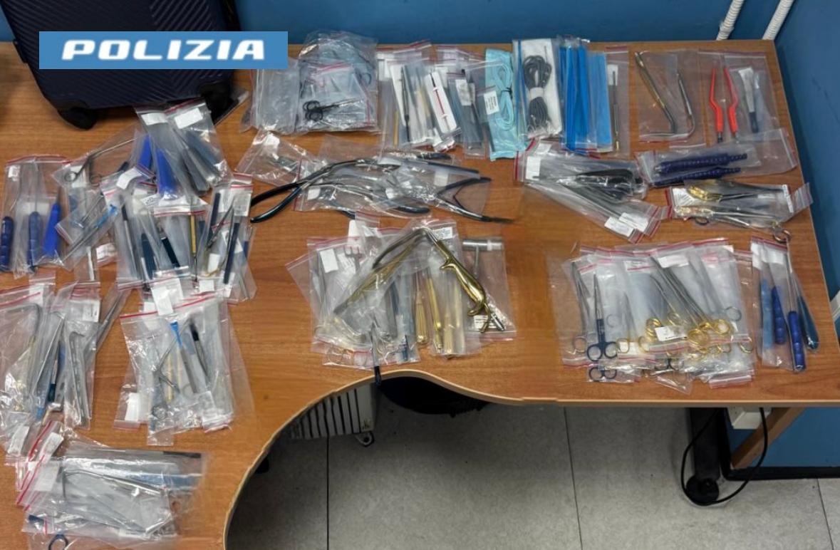 A seguito del controllo, gli operatori hanno rinvenuto nel trolley 286 attrezzi medici, privi di idonea documentazione attestante l’acquisto, di cui il 35enne non ha saputo giustificare la provenienza; il 33enne, invece, è stato trovato in possesso di 5 pinze emostatiche “mosquito” e 2 porta aghi, che lo stesso aveva appena acquistato.