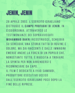 Alle ore 18, presso la sede di Corso Umberto 321 a Caivano (NA), si svolgerà la proiezione del film Jenin, Jenin, documentario del 2002 diretto dal regista palestinese Mohammad Bakri. Il film narra della distruzione del campo profughi di Jenin, in Cisgiordania, ad opera dell’esercito Isreaeliano nell’aprile del 2002. Attraverso le testimonianze dei sopravvissuti Mohammad Bakri ricostruisce, scheggia su scheggia, una storia fatta di rovine e dolore. Ma dai racconti e dalle immagini emerge anche la forza di un popolo che, nonostante tutto, è riuscita a trovare la spinta per non arrendersi e ricominciare da capo. Il film è dedicato a Iyad Samoudi, produttore esecutivo ucciso dall’esercito israeliano poco dopo la fine delle riprese.