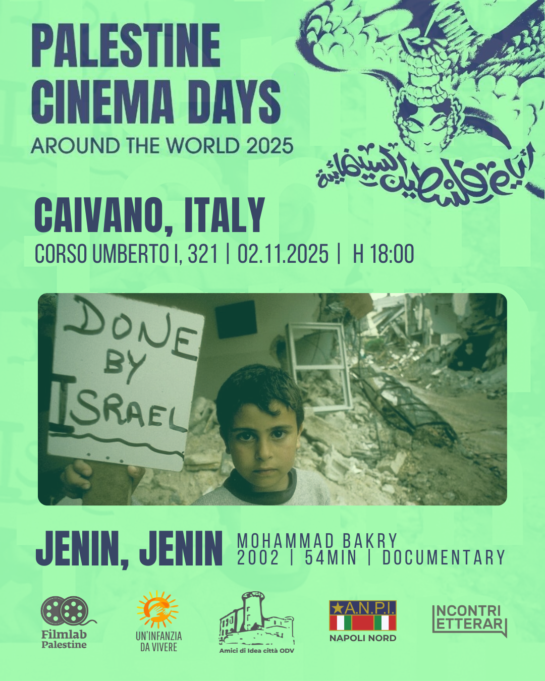Le associazioni di Caivano, Incontri Letterari, Amici di Ideacittà ODV, Un’infanzia da Vivere ODV e la sezione Napoli Nord dell’ANPI aderiscono alla giornata internazionale di cinema e proiezioni sulla Palestina che si terrà Domenica 2 Novembre 2025. L’obiettivo è quello di promuovere il cinema palestinese contemporaneo, amplificare le voci censurate e contribuire a cambiare la narrazione dominante attraverso il linguaggio del cinema.