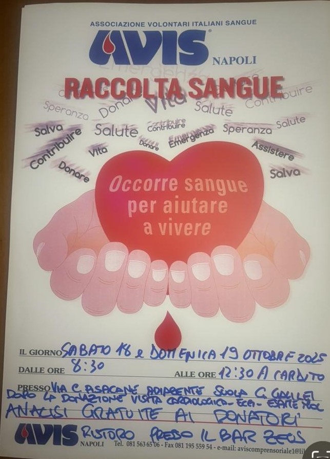 Un evento importante e di grande rilevanza sociale, programmato in collaborazione con l’Avis provinciale Napoli1 gruppo donatori di Caivano-Cardito. Tutti i donatori riceveranno, presso il proprio domicilio, il tesserino di gruppo sanguigno e l’esito delle varie analisi ed esami, che potranno effettuare gratuitamente presso lo studio del dottore Monopoli, dopo la  donazione: visita cardiologica, elettrocardiogramma, spirometria e, solo per domenica 19 ottobre 2025, anche l’esame Moc (Mineralometria ossea computerizzata).