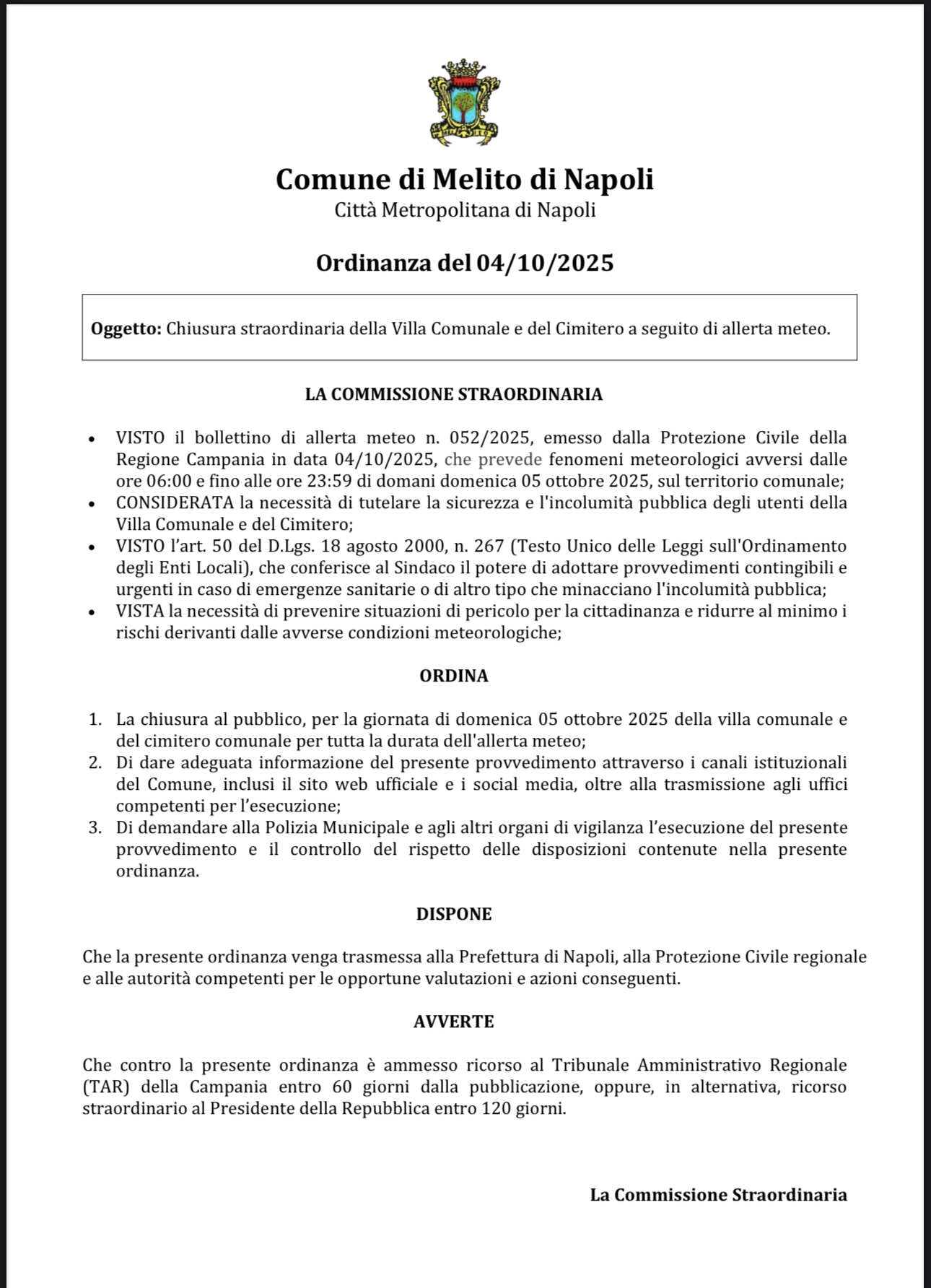 Melito : La Commisione straordinaria visto il bollettino di allerta meteo n. 052/2025, emesso dalla Protezione Civile della Regione Campania in data 04/10/2025, che prevede fenomeni meteorologici avversi dalle ore 06:00 e fino alle ore 23:59 di domani domenica 05 ottobre 2025, sul territorio comunale, e consideratala necessità di tutelare la sicurezza e l’incolumità pubblica degli utenti della Villa Comunale e del Cimitero si è disposta la chiusura delle strutture comunali.