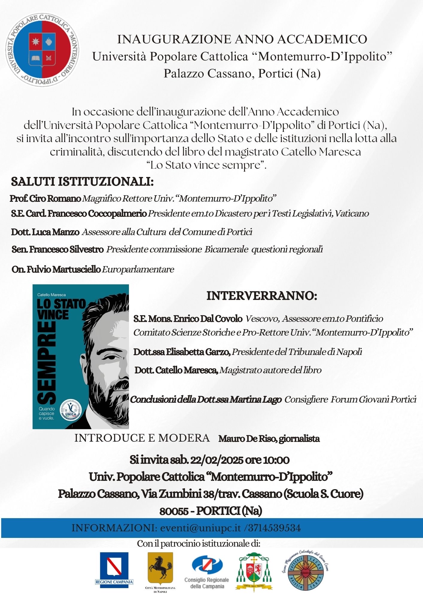 La lotta alla criminalità, il valore delle istituzioni e la centralità dello Stato nel garantire giustizia e sicurezza saranno i temi al centro della presentazione del libro “Lo Stato vince sempre” del magistrato Catello Maresca. L’evento si terrà il 22 febbraio 2025 alle ore 10:00 presso l’Università Popolare Cattolica “Montemurro- D’Ippolito”, nel prestigioso Palazzo Cassano di Portici dove nacque nel 1772 Gennaro Serra di Cassano, patriota della rivoluzione partenopea del 1799. L’incontro, che segna anche l’inaugurazione dell’Anno Accademico dell’Università Popolare Cattolica “Montemurro-D’Ippolito”, rappresenta un’importante occasione di confronto su legalità e impegno civile, con il contributo di figure istituzionali di alto profilo.