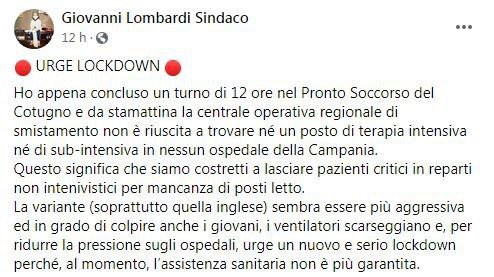 La polemica e l’allarme è esplosa letteralmente dopo il post su Facebook di Giovanni Lombardi, medico anestesista-rianimatore dell’Azienda ospedaliera dei Colli di Napoli. Il quale ha parlato nel suo messaggio di una situazione allarmante: “Un turno di 12 ore nel pronto soccorso del Cotugno e da stamattina la centrale operativa regionale di smistamento non è riuscita a trovare né un posto di terapia intensiva né di sub-intensiva in nessun ospedale della Campania.“
