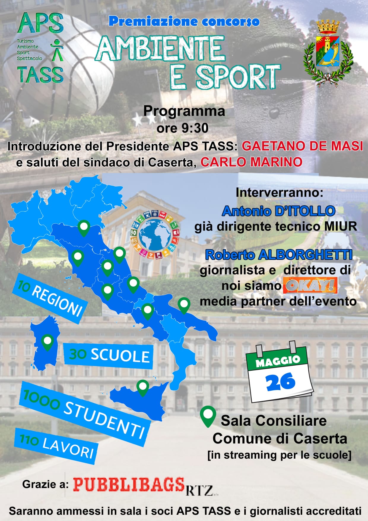 Alla cerimonia, dopo l’introduzione del presidente dell’Associazione APS TASS, Gaetano De Masi, già Dirigente scolastico , e i saluti istituzionali del sindaco di Caserta, Carlo Marino, interverranno Antonio Di Tollo, già dirigente tecnico MIUR; e Roberto Alborghetti, scrittore e giornalista, direttore di “Okay!”, media partner del concorso “Ambiente e Sport”.