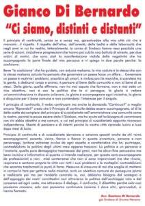 Mentre stamane attraverso i social , e varie testate giornalistiche sul web , è comparso un manifesto a firma dell’Avvocato Gianco Di Bernardo, in cui fa intendere una sua nuova discesa in campo. Nel manifesto si evince un impegno all’insegna della continuità.testualmente riportiamo un passaggio del documento redatto dall’avvocato