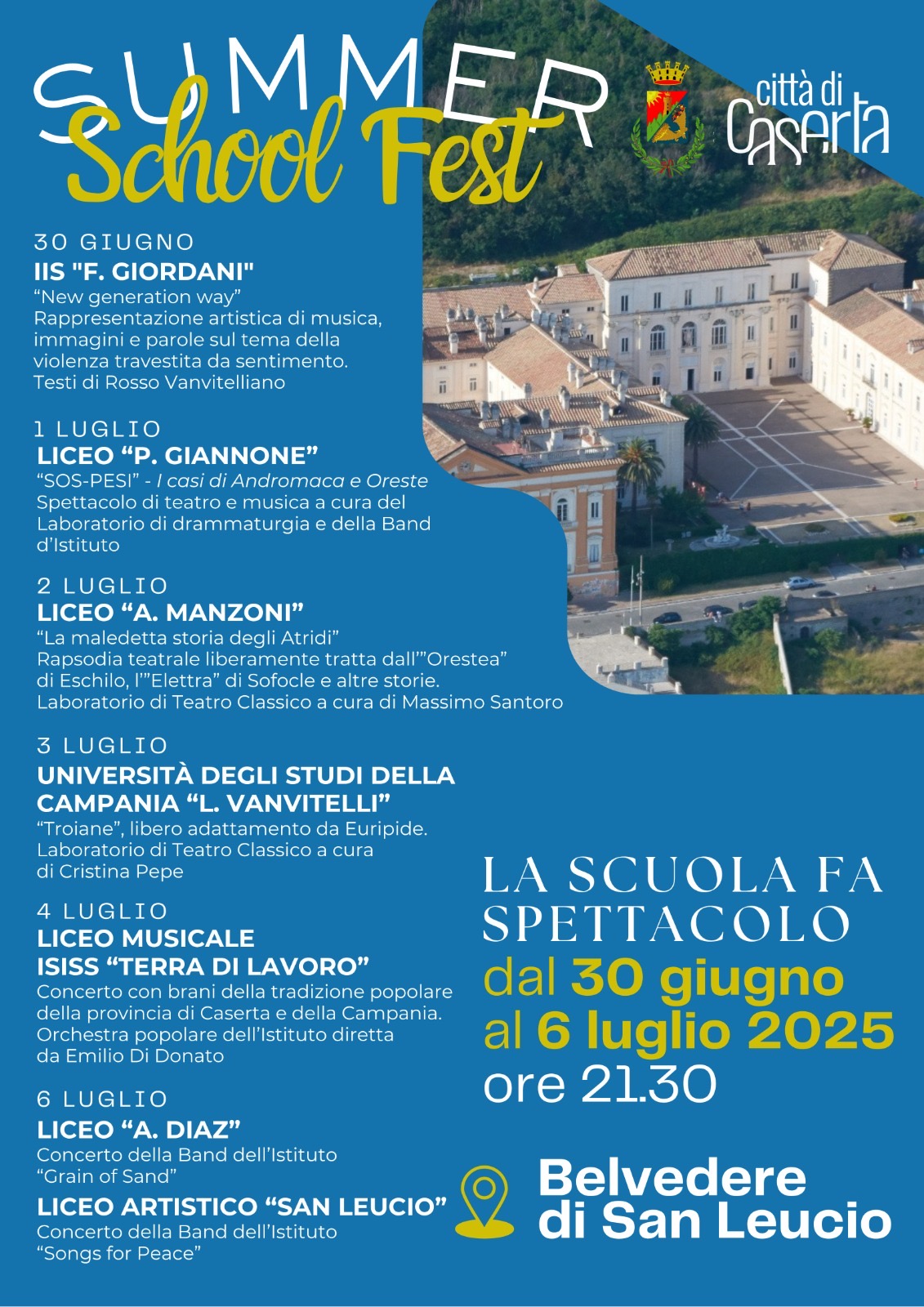 Partirà lunedì 30 giugno, presso il Belvedere di San Leucio, “Summer School Fest – La scuola fa spettacolo”, la rassegna di musica e teatro realizzata dal Comune di Caserta, in collaborazione con gli organizzatori della kermesse “Un’estate da BelvedeRe”, e che vedrà esibirsi, fino al 6 luglio, gli istituti superiori della città e l’Università degli studi della Campania “Luigi Vanvitelli”. I giovani artisti avranno un’opportunità unica, ovvero tenere uno spettacolo sullo stesso palco che verrà utilizzato dai grandi artisti protagonisti della manifestazione in programma a San Leucio.