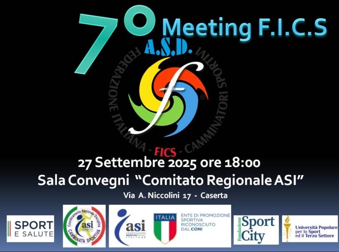 Il 27 settembre si è svolto con successo il 7° Meeting Nazionale della Federazione Italiana Camminatori Sportivi (FICS) a Caserta, presso la sede regionale dell’ASI (Associazioni Sportive e Sociali Italiane). L’appuntamento ha visto la partecipazione di dirigenti, tecnici e rappresentanti territoriali provenienti da diverse regioni italiane.