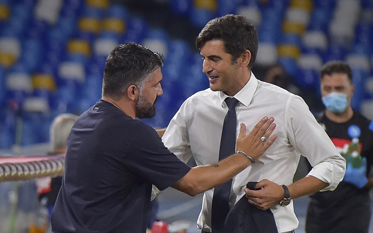 Foto Fabio Rossi/AS Roma/LaPresse 05/07/2020 Napoli (Italia) Sport Calcio Napoli-Roma Campionato Italiano Serie A TIM 2019/2020 - Stadio San Paolo Nella foto: Paulo Fonseca, Gennaro Gattuso Photo Fabio Rossi/AS Roma/LaPresse 05/07/2020 Naples (Italy) Sport Soccer Napoli-Roma Italian Football Championship League Serie A Tim 2019/2020 - San Paolo Stadium In the pic: Paulo Fonseca, Gennaro Gattuso